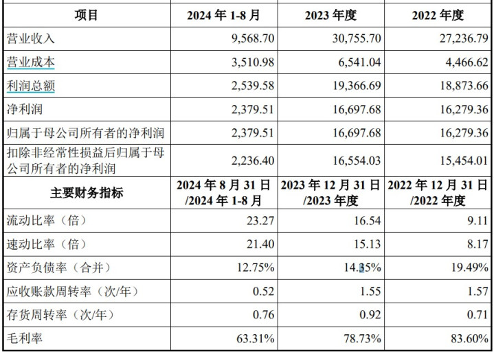 科凯电子2022年和2023年收入分别为2.72亿元和3.08亿元。2024年前8月,公司收入为9568.7万元,未达到上年收入的三分之一。与此同时,公司2022年、2023年和2024年前8月归母净利润分别为1.54亿元、1.66亿元和2236万元。
